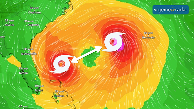 VjetarRadar prikazuje kretanje zraka oko centra dva uragana, ali zbog blizine, već utječu jedan na drugi
