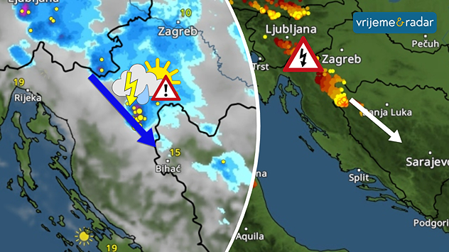 VremenskiRadar prikazuje kretanje pljuskova sa grmljavinom, praćena i tučom/gradom. Radar munja prikazuje vremenski "zapis" grmljavine unazad par sati