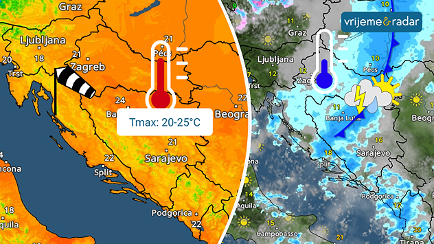 TemperaturaRadar prikazuje rast temperature lokalno do 25°C. U ponedjeljak Vrijeme&Radar pokazuje kretanje hladne fronte sa kišom
