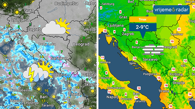 Vrijeme&Radar prikazuje kišu i pljuskove na Jadranu i uz njega, sjevernije većinom suho. TemperaturaRadar pokazuje temperature iznad 0°C narednih dana,
