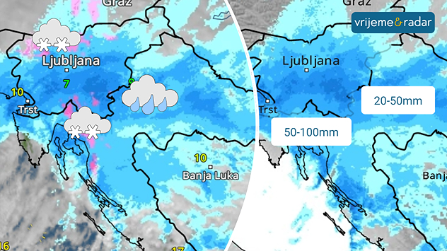 Vrijeme&Radar daje prikaz jačine i vrste oborina. Snijeg je padao u gorju, bilo je i obilne kiše.