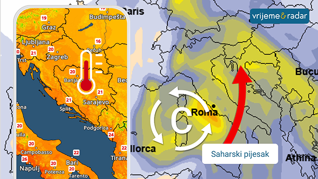 TemperaturniRadar pokazuje temperature oko/preko 20°C. Desna slika pokazuje koncetraciju saharskog pijeska za ponedjeljak