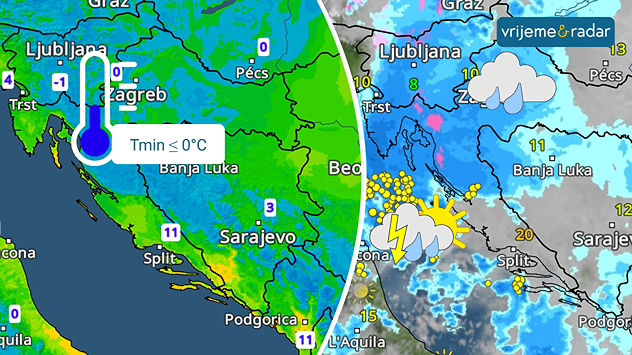 TemperaturaRadar: Temperatura se jutros kreće od oko -2°C do 4°C na kopnu, na jugoistoku regije i toplije. Na Jadranu oko 10°C. U nedjelju nova promjena.