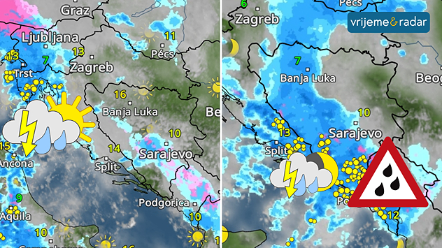 VremenskiRadar: Poslijepodne jače naoblačenje s kišom, pljuskovima i grmljavinom, prvo na sjevernom Jadranu, Noću se širi na veći dio regije.