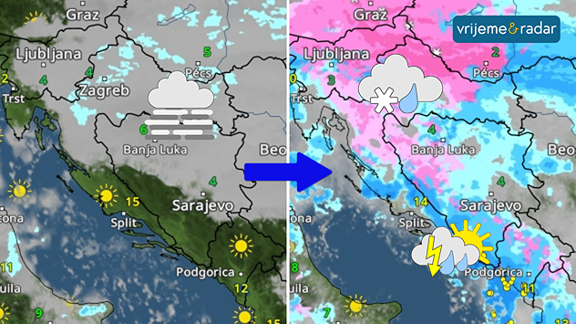 U srijedu pretežno oblačno sa mjestimičnom kišom, na jugu i pljuskovi sa grmljavinom, u višim predjelima sa susnježicom i snijeg, u Krajini moguće i u nižim predjelima.