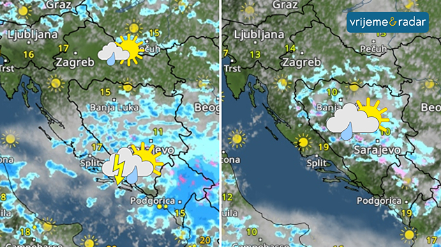 VremenskiRadar prikazuje promjenljiviji utorak (lijeva) od srijede (desna slika)
