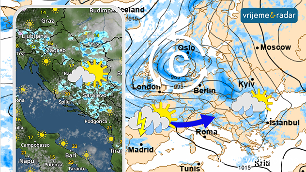 Ciklonalna aktivnost između V. Britanije i Skandinavije trasira put vlažnom zraku sa Atlantika sve do nas. Vrijeme&Radar za petak daje nam šansu za sunčane intervale.