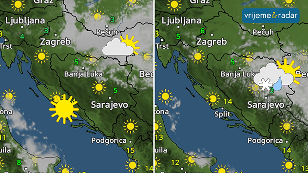 Temperatura danju 1-7°C, na planinama hladnije, u Hercegovini 6-15°C. Sutra malo hladnije u Bosni, a jutra sve do utorka hladnija, lokalno u višim predjelima oko -10°C. Vjetar slab-umjeren sjeverni, u Hercegovini ponegdje jak, u nedjelju prolazno umjeren i jak sjeverni-sjeverozapadni, u Hercegovini jaka-olujna bura.