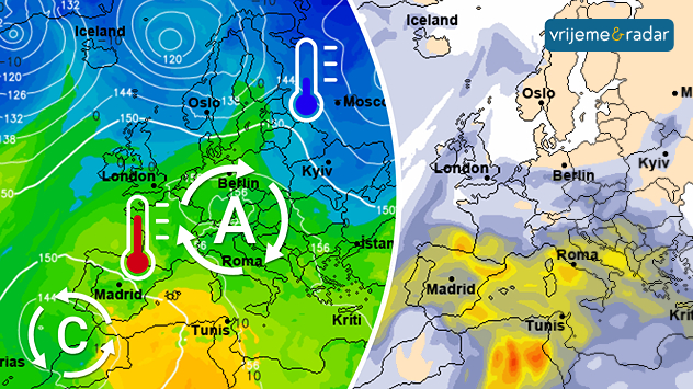 Ostajemo pod djelovanjem anticiklone i većinom stabilnog vremena. Hladnoća ja daleko od nas. Dolazit će više saharskog pijeska (desna slika)