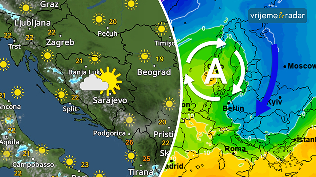 Većinom pretežno sunčano i stabilno. Krajem utorka i noću naoblačenje uz pad temperatura zraka, koji stiže sa istoka Europe