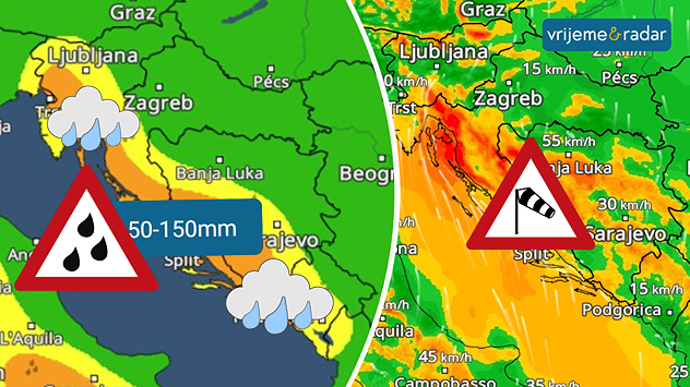 Upozorenje na obilnije oborine na Jadranu i uz njega, zapad i jug BiH; 50-150m do srijede, lokalno i moguće preko 200mm. Vjetrovito.