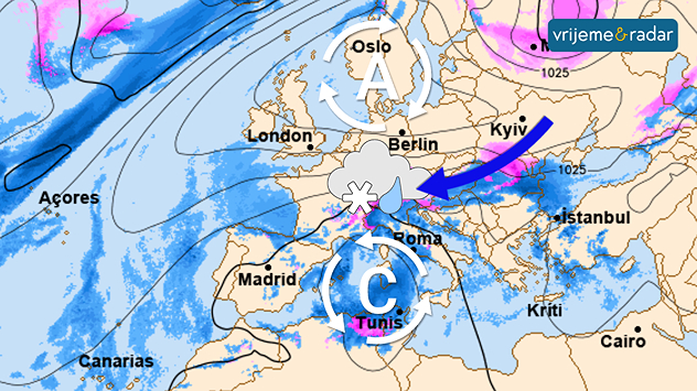 Radi se o dalekim terminima, tako da se još ne može definirati točna pozicija ciklona, a promjena na ovom dijelu Balkana bi, prema trenutnim izgledima, ponegdje donijeti kišu, uglavnom tek na planinama snijeg. Kada se termin približi bit će detaljnija prognoza vremena.
