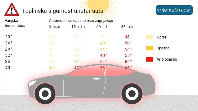 Ovih dana temperature u mnogim mjestima prelaze 32°C, tako 10 minuta od trenutka kada zatvorite vrata automobila zrak unutar njega se zagrije na 39°C, za 30 minuta na 48°C, a za 60 minuta temperatura u autu dostigne čak 58°C.