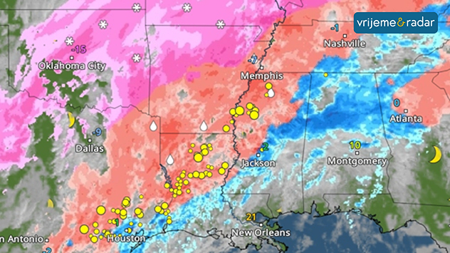 Meteorološki radar pokazuje ogromnu ledenu oluju iznad juga Sjedinjenih Država.