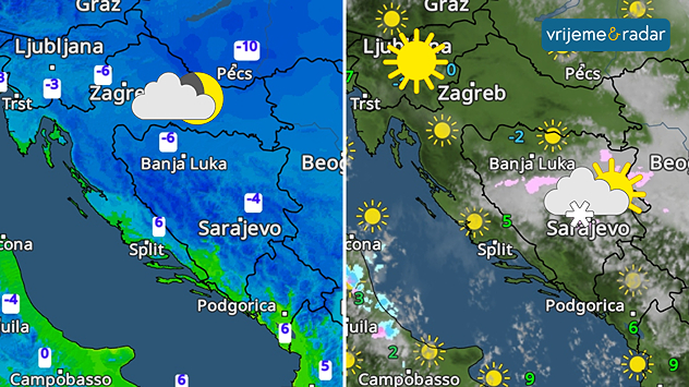 TemperaturniRadar pokazuje hladno jutro u nedjelju, danju razvedravanje prikazuje VrijemeRadar